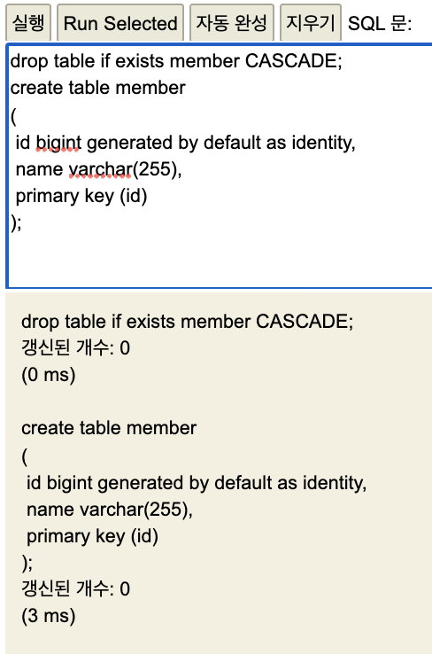 이후에 sql 문장으로 필요한 member table을 생성 해 준다.
