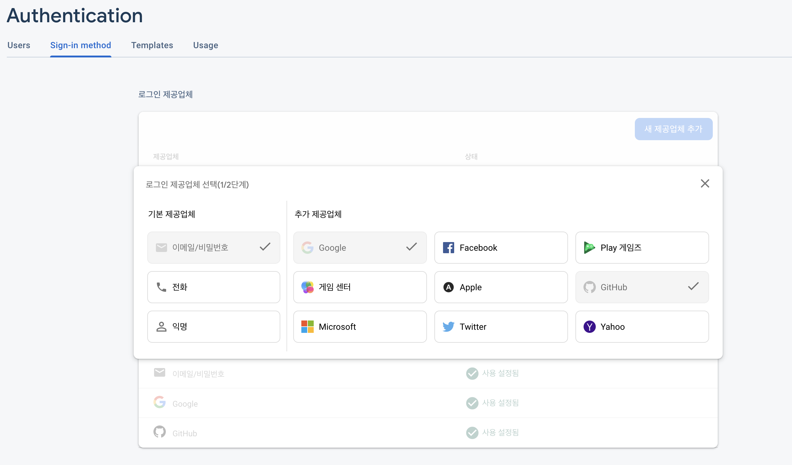 firebase 콘솔에서 authentication에 가면 다음과 같이 로그인에 사용할 플랫폼을 추가할 수 있다.